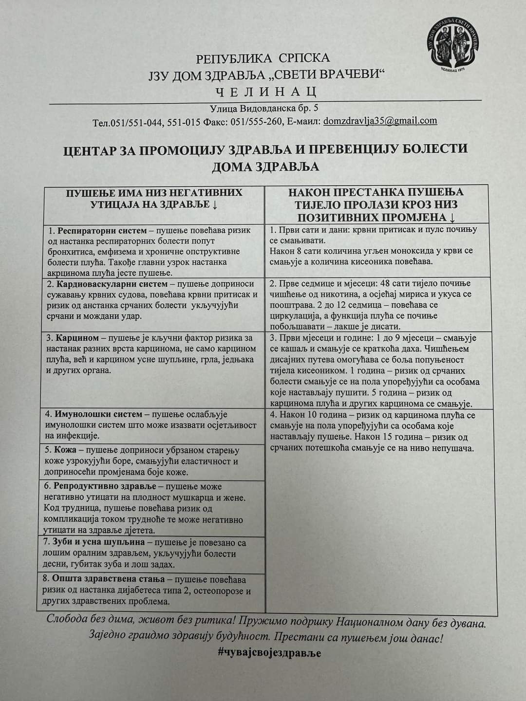 Дом здравља је посвећен промотивно превентивним активностима те свакодневно се кроз породичну медицину и друге службе указује о штетности дувана и дају адекватни савјети о престанку пушења.